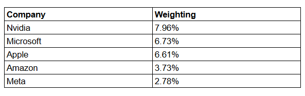 The table below shows the top 5 companies on the index as at 15 October 2025. These 5 companies are all tech- and technology-related businesses and make up almost a quarter of the index in terms of value. As companies grow in value faster relative to other companies in the index, then their weighting will increase.